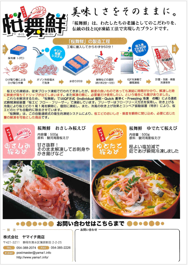 桜えびby admin2024年8月19日2024年8月19日 ヤマイチ商店の桜えびは、IQF凍結美味しさを新鮮なまま瞬間冷凍!「生流通」より、活きが良い。 ◆一匹ずつ、瞬間冷凍。◆髭取り除き済み。◆オゾン冷却水で洗浄。美味しさをそのままに。ヤマイチの桜舞鮮。